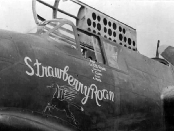 The nickname "Strawberry Roan" is in a cursive font. Below is the nose art of a Pegasus flying horse. Below the cockpit window is "Pilot 1st Lt. J. B. Roan, Crew Chief T. Clark Assistant [Crew Chief] A. Mata. The cockpit canopy side window and hatch are open. Credit: U.S. Army Signal Corps Date: February 1943