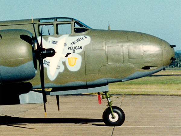 Visible is the nickname "The Hell'N Pelican II" and the nose art of a pelican with wings spread with a bomb under the right wing atop a light blue outline.
