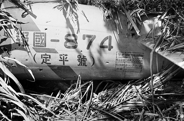 The rear fuselage has the Hinomaru (Rising sun), Houkoku Gou 874 (Patriotic Presentation Number 874) donated by Sadahei and the rectangular serial stencil with manufacture number 3032 and construction date of 2-7-3 [July 3, 1942]. Several bullet holes or shrapnel holes are vislbe on the fusealge surface. Vegitation atop and below the aircraft.
