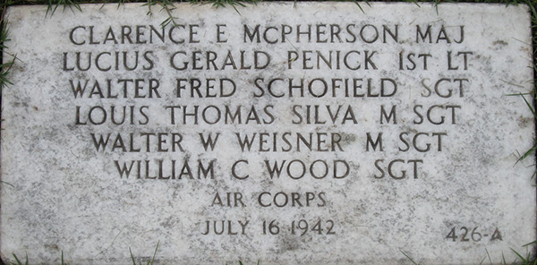 Jefferson Barracks National Cemetery group burial at section 79 site 426A-B Six crew and passengers aboard B-17E 41-2421 crashed July 16, 1942: