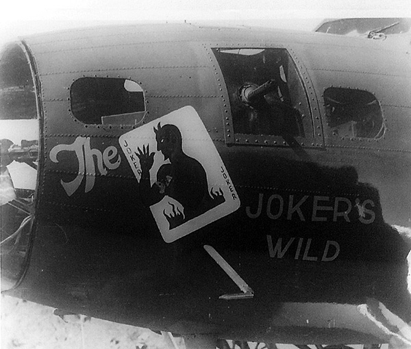 Left side of the nose with the nickname "The Joker's Wild" in capital letters outline with the nose art of two playing card of a devil joker card. Below the navigator window is the U.S. Army Air Force serial number stencil.