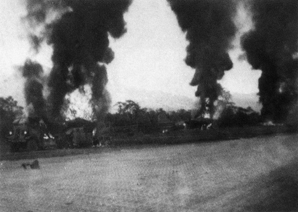 In the foreground is a taxiway made of marston matting (PSP). Beyond is equipment burning after the air raid including (left) a truck and (center)