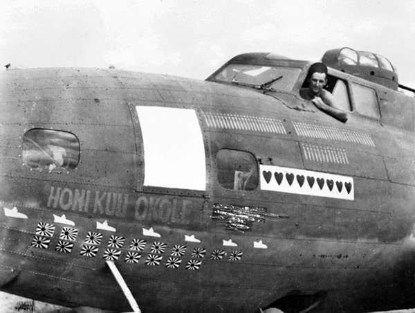 The left side of the nose has the nickname "Honi Kuu Okole" in block letters with a scoreboard including eighteen Japanese rising sun flags in two rows (10x8) and seven silhouettes of ships. Below the pilot's window were bomb markings in two rows indicating missions flown. Below is a row of Purple Hearts inside a white rectangle indicating crew members who were wounded aboard the bomber on combat missions and earned the Purple Heart. A censor has cut out portions of the photograph that appear as white areas including the navigator's window and the U.S. Army Air Force serial number stencil has been scratched out.