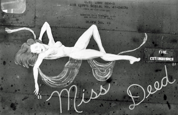 Nicknamed "Miss Deed" in a cursive style with quotation marks around the name on both sides of the nose with the nose art of a nude woman on her back with one hand behind her head and the other arm downward. At the center right is stenciled "Fire Extinguisher" on the access hatch. At the upper center is the U.S. Army Air Force (USAAF) serial number stencil that reads: