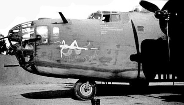 Nicknamed "Miss Deed" in a cursive style with quotation marks around the name on both sides of the nose with the nose art of a nude woman on her back with one hand behind her head and the other arm downward. Below the cockpit is the scoreboard with at least 35 bomb markings indicating combat missions flown and seven aircraft silhouettes for aircraft claimed as shot down.