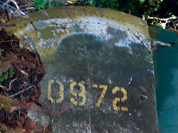 Visible is the yellow stenciled "0972" part of the full serial number 42-40972. At the upper edge of the tail (top of photo) is a yellowish discoloration from where the bomber's deicer boot was attached. At the rear of the tail (right edge of photo) is the teal-colored rudder fabric, incredibly intact 61 years after the crash.