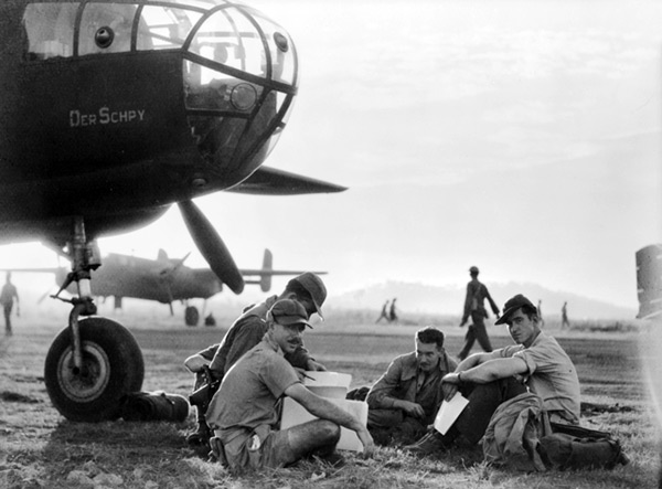 (Seated left to right) Captain Ron Hubbard (looking towards camera), 1st Lt. Ralph L. Schmidt (behind looking at file), the person behind whose right elbow is visible is unidentified. At the center is Royal Australian Air Force (RAAF) P/O Edward Mobsby, (wearing jacket and leaning) and 1st Lt. Bill "Red" Johnson. In the background are Allied personnel and beyond a parked B-25C Mitchell.