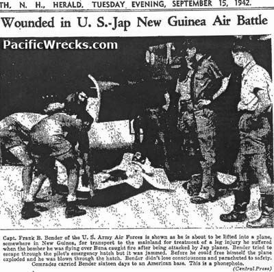 Capt. Frank B. Bender of the U.S. Army Air Forces is shown as he is about to be lifted into a plane, somewhere in New Guinea, for transport to the mainland for treatment of a leg injury he sufferer when the bomber he was flying [B-25C "Aurora" 41-12792] over Buna caught fire after being attacked by Jap planes. Bender tried to escape through the pilot's emergency hatch by it was jammed. Before he could free himself the plane exploded and he was blown through the hatch. Bender didn't lose consciousness and parachuted to safety. Comrades carried Bender sixteen days to an American base. Do you have a copy of this original article? Contact Us
