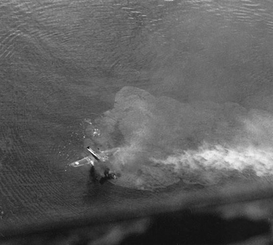 Aerial view of B-25D Mitchell 41-30118 after ditching taken from another B-25 Mitchell overhead