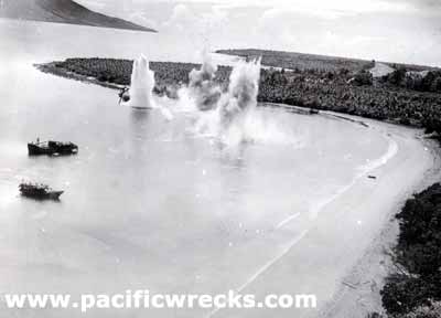 B-25D 41-30345 damaged by bomb blast crashes into Hansa Bay [2of3] In the harbor are two "Sugar Charlie" 500 ton Japanese ships, in the background is Manam Island.Second photograph in a sequence of three [Photo 1, Photo 3] Credit: USAAF, 3rd BG, 8th BS Date: August 28, 1943