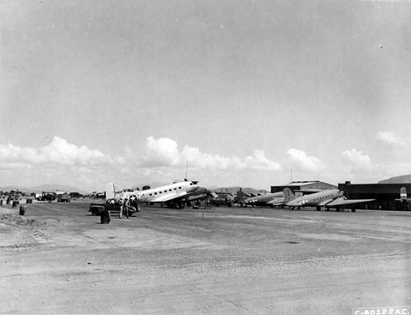 In the foreground is a car with several American personnel. In the background is a row of parked C-47 Skytrains a fuel bowser and beyond hangers.