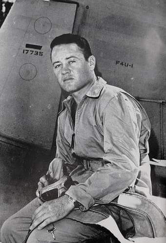 Major Gregory "Pappy" Boyington holding his flight gear seated on the tail stabalizer of F4U Corsair 17735