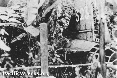 In the background at the upper right is tail with "323", the left horizontal stabilizer is missing. The green paint on the upper surfaces is starting to show signs of weathering and the rudder fabric is missing, likely burned off in the crash or rotted away. The perspex in the tail turret panels likely broke off or fell out during the crash. Likely, this shrine was created on April 18, 1944 to mark the one year anniversary of the crash. The vegetation has begun to regrow at the crash site including banana trees, possibly planted by villagers.