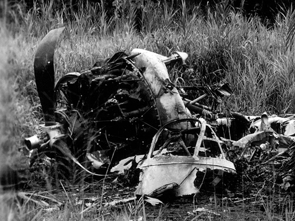 In the center is the nose cone, both engine have their three bladed propellers bent backwards indicating a force landing.