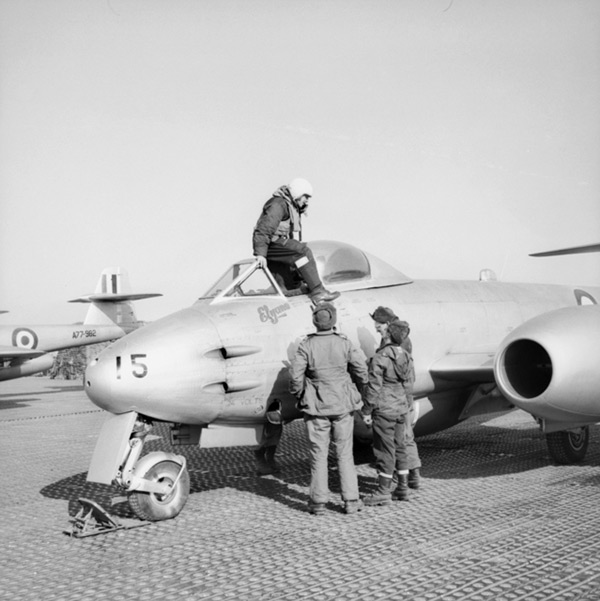 W/O Bob Turner exiting the cockpit of Meteor A77-15 at Kimpo Airfield (K-14) in South Korea