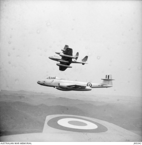 In the foreground is the right wing with RAAF Roundel of the photograph plane. At the center is Meteor A77-982 in horizontal flight with two other Meteors peeling off beyond.
