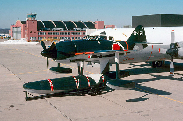 Restored with dark green upper surfaces and gray lower surfaces with tail code X-121. The rear fuselage had an orange horizontal stripe and a white diagonal stripe. The wings had an orange identification stripe on the leading edge and a replica 30 kg bomb under each wing. The center pontoon had four red horizontal stripes outlined in white.