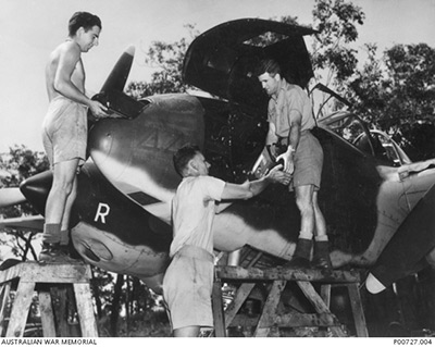 RAAF personnel loading an aerial camera aboard Lightning A55-3 at Coomalie Creek Airfield near Darwin. The "R" on the right engine cowl is for photographic purposes. Beneath the RAAF camouflage is the prior "44" on the nose. Credit: N. M. Walker via AWM P00448.148 Date: c1943