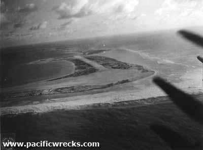 Visible in the foreground Canton Airfield with the north-south runway at the center and the east-west runway (still in use today) at the center left with a large circular turnaround area connecting the two runways. at the northwest tip of Canton Island. Credit: Ken Barber Date: 1944