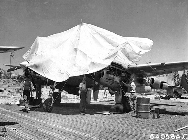 Parachute used as a sun shade atop P-38L Lightning 44-25880 at