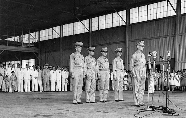 General Douglas MacArthur and staff salute at Zablan Airfield (Camp Murphy) during the induction of the Philippine Army Air Corps (PAAC) into the U.S. Army and incorporated into the Far East Air Force (FEAF)