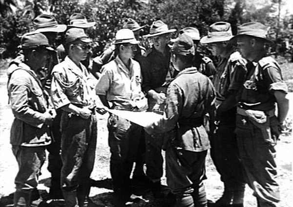 includes Imperial Japanese Navy (IJN) Commander Takahashi, Lt. Tsuji, Lt. Honda and Petty Officer Suzki. The Australians are members of 2 Corps, Headquarters and making an inspection of overgrown Bonis Airfield for use as an assembly area Japanese troops in northern Bougainville. Credit: Australian Army via AWM 096622 Date: September 15, 1945
