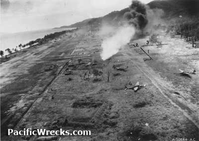 Visible are parked twin engined bombers and revetments. A fire is burning from the strike.
