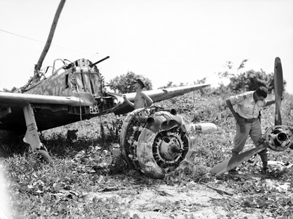 (Right) Royal Australian Air Force (RAAF) Flight Lieutenant L. F. Green, 265472 inspecting the propeller.