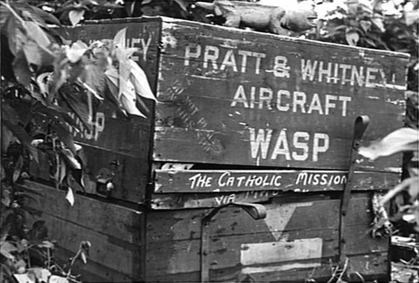 Wooden crate abandoned at Danip Airfield (Alexishafen Airfield No. 1) near Alexishafen The wooden crate is stenciled with "Pratt & Whitney Aircraft Wasp" and addressed to "The Catholic Mission via Madang".