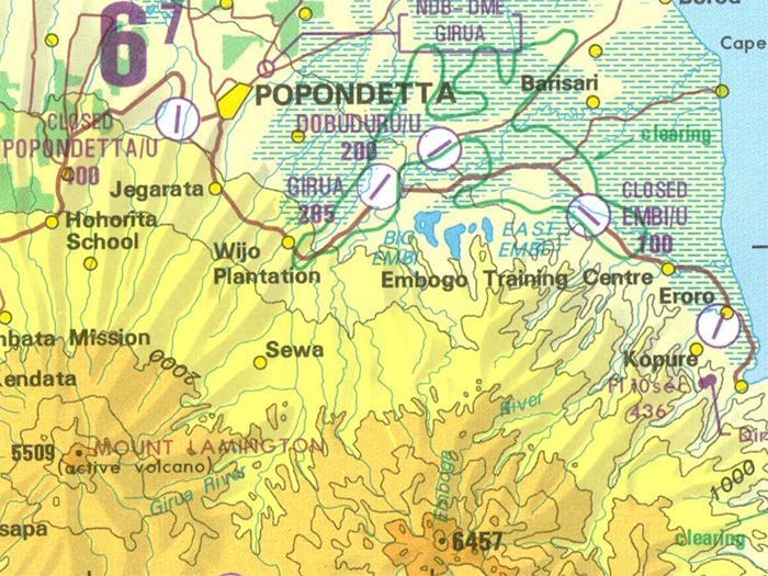 Includes Popondetta Airfield (Closed), Popondetta, Girua (Girua Blocks), Girua Airport (Dobodura No. 7, Kenny), Dobodura Airfield (Horanda 4Y), Embi Airfield, Oro Bay Airfield (Closed), Oro Bay, Mount Lamington, Embi Lakes (Big Embi, East Embi), Embogo, Eroro, Kopure, Emboga River, Giru River, Hohorita School, Jegarata, Barisari and Cape Sudest.