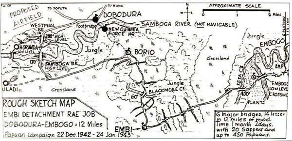 The map indicates: Proposed Airfield (Horanda 4Y, Dobodura No. 4), Uladi, Horanda, Samboga Bridge, Samboga River (not navigable), Dobodura, to Soputa, to Buna, New Guinea Force HQ, Borio, Blackmore CS, Embi, Embogo River, Keta C's, Pantz. It also indicates at right "6 major bridges, 14 lesser in 12 miles of road, time 1 month 2 says with 20 sappers and up to 450 Papuans". And 6 Platoon, 7 & 8 Coy. Approximate scale 2 miles.