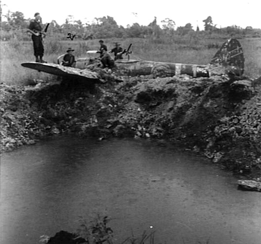 Ki-43-II Oscar from the 59th Sentai near bomb crater filled with water at Madang Airfield