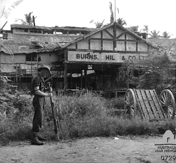 Australian of the 8th Infantry Brigade examines an abandoned Japanese weapon outside the ruins of the Burns Philp & Co. Ltd warehouse building in Madang This building was used by the Japanese Army as a storehouse. A wheeled push cart is visbile at right Credit: AWM 072989 Date: April 24, 1944