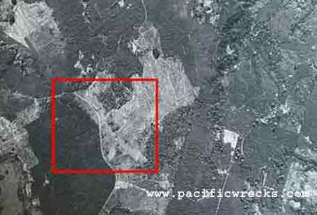 Seven years after the end of the Pacific War, the runway is barely visible outlined by the red square