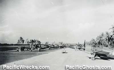 flightline with parked F4U Corsairs and F6F Hellcats