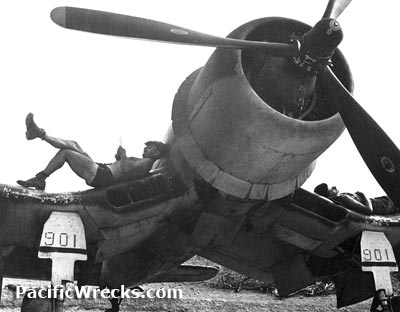 VMF-222 ground crew relaxes atop F4U Corsair 901 at