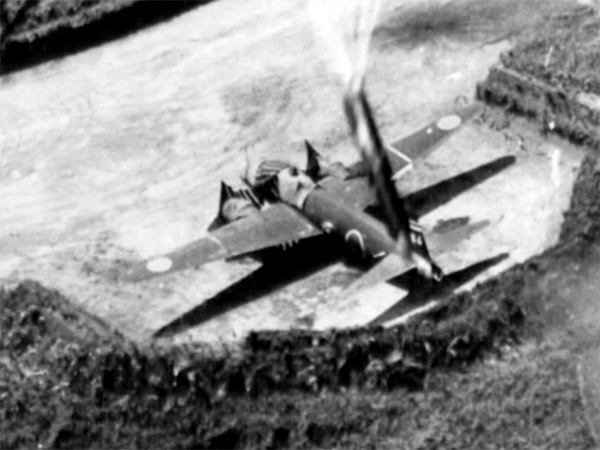 Enlargement of parafrag bomb released over G4M1 Betty parked in a revetment at Vunakanau Airfield