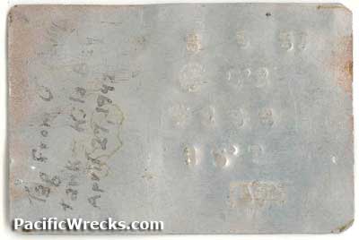 "Tag from 0 tank - Kila April 27, 1942" Credit: Doan Collection via Edward Rogers Date: 2006