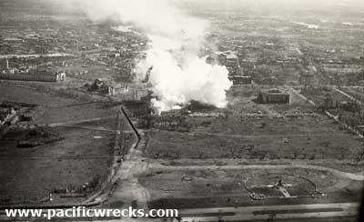Aerial view of burning building near