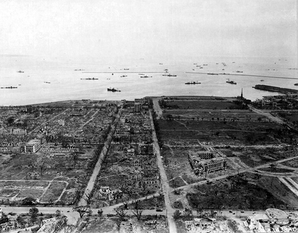 In the upper right is the Manila Hotel and the Port Area. At the center right is damaged Agriculture Building. Inside Manila Harbor are shipwrecks of partially sunken Japanese vessels and beyond other vessels. Credit: USAAF Date: May 1945