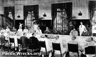 This painting depicts Japanese Prime Minister Hideki Tojo and his chief of staff meeting with Philippines President Laurel in the Manila Hotel during Tojo's visit to Manila. Postwar, during the U.S. occupation of Japan this painting deemed to be propaganda and was take by the U.S. Army and placed into storage. A black and white photograph was taken for historical purposes. Later the original painting was returned to Japan.