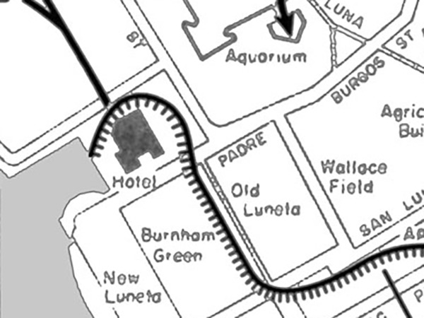 The map is the cenral area of Manila including Ermita District with Manila Hotel and Burnham Green (Rizal Park) bordering Manila Bay. The hatched line indicates the U.S. Army front line "Special Security Force" on the evening of February 22, 1945. At the upper edge of the map is the southern wall of Intramuros. Credit: Chapter XV The Drive Towards Intramuros page 298 Date: February 23-March 3, 1945