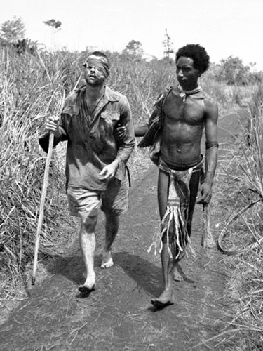 Australian Private George Whittington being helped along a track near Buna towards a field hospital at Dobodura The Papuan helping him is Raphael Oimbari. Whittington was with the 2/10th Battalion at the time and had been wounded the previous day in the battle for Buna Airfield. He recovered from his wounds but died of scrub typhus at Port Moresby February 12, 1943. Credit: George Silk Date: December 25, 1942