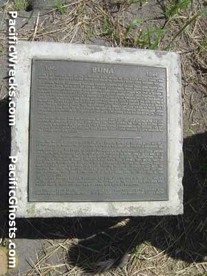 Plaque reads: "Buna was part of a concetrated 20km long coastal defense position which was held by 9,000 Japanese against the advancing Australian and American forces in November 1942.