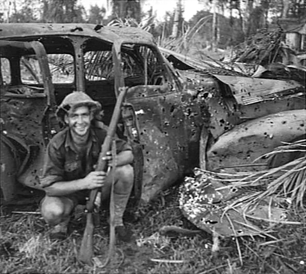 Australian Army soldier with a Japanese staff car riddled with bullet holes n the middle of Gona