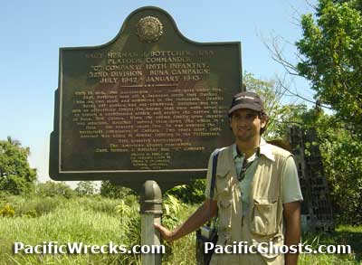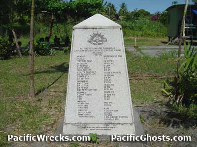 Location Lat 8° 40' 0S Long 148° 24' 0E Buna Station (Buna Mission) is located at Buna on the north coast of New Guinea. Prewar and during the Pacific War located in the Northern District of Territory of Papua. Today located in Oro Bay Rural LLG, Ijivitari District of Oro Province in Papua New Guinea (PNG). Prewar This location was developed into the Buna Government Station and Buna Mission, an Anglican mission station. Also known as Buna Station, Buna Government Station and Buna Mission. Nearby was the Government Gardens, growing crops to support the station. Wartime History On July 21, 1942 at 2:40pm a Japanese float plane strafed Buna station. Account by Allan Champion, Resident Magistrate. During "Operation RI", a Japanese convoy arrived off Gona and began landing troops that advanced inland and occupied the Buna area. Battle of Buna On November 19, 1942 the U.S. Army, 32nd Division attacked the from both flanks the area encompassing Buna to Cape Endaiadere, but were quickly pinned down by the formidable and well hidden Japanese defenses. Brutal fighting ensued for the month of November. Under Lt. General Robert L. Eichelberger, the U.S. Army made gains on the left flank and captured the government gardens and isolated Buna Mission from Giropa Point. On January 1, 1943 at 8:00am, two Australian battalions, the 2/10th and the 2/12th with six Stuart tanks and two American battalions continued the attack on the Japanese positions east of Giropa Point. The tanks, working with precision, rolled close to the enemy's bunkers and lashed them with fire while the infantry rushed forward and hurled charge that finally began to overcome enemy strong points. At the end of the long day, few Japanese posts east of Giropa Point still remained, and were each eliminated. On January 2, 1943 Buna was captured by American troops. Today Buna was destroyed during the battle. Only the concrete foundation of the government station remains today. Slightly inland, are some huts and a Medical Center and memorials. The village area has tracks from tanks or vehicles, and rusted ammunition boxes from the battle on display. Also, several memorials near the beach. Also, the wing and tail section of G6M1-L2 Betty 209 is on display. Buna Australian Memorial Memorial pillar with inscriptions on each side. Side 1: reads in English and Tok Pidgin: "Australia Remembers - This medical center and memorial are for the people of Buna and Sanananda in appreciation of the support and help given to Australian servicemen who fought and died here in November 1942 - January 1943, this plaque is based on the photograph taken in this area on 24th December 1942. May this friendship be everlasting." Side 2: is a history of the battles for Buna and Sanananda. Side 3: reads in English and Tok Pidgin: "In memory of the Australian servicemen and the Papua New Guineans who lost their lives in the common cause during the battles for Buna and Sanananda from November 1942 to January 1943." Side 4: A roll of honor, listing all the Australian units that participated in the battle. 75mm Anti-Aircraft Gun Type 88 Serial Number 1018 Emplaced in the Government Gardens area, captured intact recovered to Australia. Buna Battlefield Bronze Plaque Bronze plaque on a concrete square placed on the ground in the center of Buna village. Inscribed in both English and Tok pidgin, dedicated in 1994. Read plaque inscription. SSgt Herman J. Bottcher Memorial Lat 08 40.172 S Long 148 24.602 E Located at the entrance to Buna village. This American memorial marker stands about 2m tall, and has a brass plaque with inscription. Buna 32nd Division Memorial In memory of our fallen buddies, brass plaque with inscription. Contribute