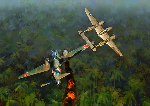 Depicts P-38G Lightning shooting down G4M1 Betty with Admiral Yamamoto aboard over southern Bougainville.