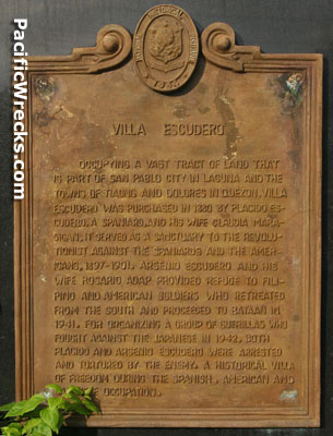 "Occupying a vast tract of land that is part of San Pablo City in Laguna and the towns of Tiaong and Dolores in Quezon, Villa Escudero was purchased in 1880 by Placido Escudero, a Spaniard, and his wife Claudia Maria-Sigan. It served as a sanctuary to the revolutionist against the Spaniards and the Americans 1897–1901. At the start of the Pacific War, Arsenio Escudero and his wife Rosario Adap provided refuge to Filipino and American soldiers retreating from the south to Bataan. For organizing a group of guerrillas who fought against the Japanese in 1942, both Placido Escudero and Arsenio Escudero were arrested and an tortured by the Japanese. A historical villa of freedom during the Spanish, American and Japanese occupation."