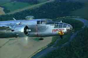 Roaring Glory Warbirds Series B-25 Mitchell Roaring Glory B-25 Mitchell is a documentary that takes the viewer inside one of the Pacific's most famous bombers. For aviation enthusiasts, veterans and those who appreciate the timeless sounds of a classic warbird, this video puts you in the cockpit and behind the controls of B-25J-30-NC "PANCHITO" Serial Number 44-32734 for flight above Geneseo, New York. The video begins with a superb in flight sequence with the Mitchell, with no music or any other distractions to take away from the beauty of this classic bomber, or sounds of its engines in flight. Warbird aficionados will appreciate extensive views of the B-25J including dramatic views from the the nose position, looking over top the .50 caliber machine gun. The introduction ends with the bomber landing on a grass strip, just like it would have on may Pacific airfields, and host Jeff Ethell emerging from the cockpit to introduce the program. Host Jeff Ethell takes the audience on a tour of the bomber, its cockpit and controls, electric systems and gun positions. He goes through the bomber's preflight procedure - checking the engine's oil, fuel and hydraulic levels. Aspects of the Mitchell's quality engineering are highlighted, and how the bomber was designed with safety in mind to accommodate young pilots with only 200 hours of experience. Its controls were regarded as heavy but the bomber will go exactly where you want. Ethell feels there is no better multi-engine WWII cockpits in terms of its straight forward layout. Preflight for the B-25 Next, the viewer accompanies the Mitchell on a flight. The audio is their microphone conversation, which serves as an excellent commentary about preflight procedures and flight operations. There is excellent cutting between view of pilots, instruments, and exterior shots of all aspects related to take off and taxing of the bomber. For those interested in the nuances of the B-25 performance, quirks and handling, both pilots discuss a range of topics, including how the Mitchell's nose wheel had no steering, forcing the pilot to use differential power to prevent the oscillation of wheel known to pilots as the "Baghdad Dance". Or details like the plane's fuel consumption, feathering checks, and the final takeoff check list. Historical Recreations The video has several historical reenactment segments, where actors in 5th Air Force uniforms climb into the plane and recreate the past. These segments are shot in a sepia tone to approximate WWII film stock, and footage from the 500th BG "Air Apaches" combat film adds dramatic combat action to the drama. A second sequence details force landing a Mitchell over Lingayen in the Philippines without its right-side stabilizer. Both segments remind the viewer of the deadly purpose of this plane nearly sixty years ago. Aerial Sequences The viewer takes to the sky with the Mitchell for a series of maneuvers over the beautiful tree covered country side. The camera cuts between an exterior view from the adjacent chase plane and inside the bomber for views from the cockpit, over the pilots shoulders and from the forward nose position. The B-25 performs open bomb bay and bombing run approaches for the camera, and the pilots discuss procedures about loosing an engine, and flying single engine. Dolby Surround Sound Recorded in Dolby Surround Sound, simply hearing this tape is impressive, as it utilizes the best audio standards for VHS tape, the sounds of the Mitchell's engines, on the ground and in the air during maneuvers and level flight. Approach and Landing The end sequence of B-25 in flight set to a classical music score is a dramatic conclusion to this timeless aircraft. As the bomber begins its approach, the wheels are lowered and 1/4 flaps position the plane to cross the airfield at 120mph. As the Mitchell touches down for a perfect landing, both pilots perform their post-landing check list while taxing. As it costs $1,000 to $1,500 an hour for fuel, maintenance and insurance, this video is closest most enthusiast will get. Highly recommended for an excellent study of the B-25 Mitchell, on the ground and in the air. Unlike many other warbird videos out there, this video is excellent in terms of production values, historical information and aerial cinematography that let the sight and sound of this warbird take center stage. Review by Justin Taylan Return to Book Reviews | Add a review or submit for review |
