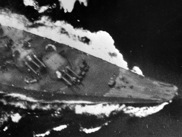 Aerial view of Yamato turning as a bomb explodes off the port side in the East China Sea